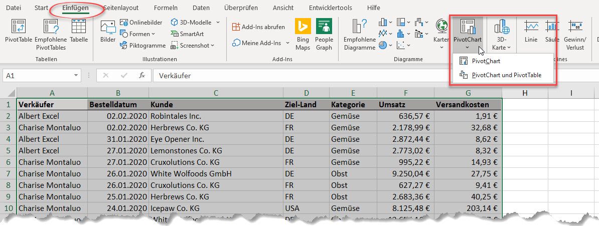 Pivot Chart direkt aus den Rohdaten heraus erstellen